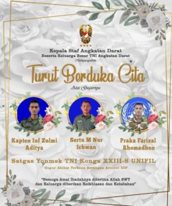Jakarta, SiberSulut :Pemerintah menyampaikan rasa dukacita yang mendalam atas gugurnya tiga prajurit Tentara Nasional Indonesia (TNI) yang tergabung dalam United Nations Interim Force in Lebanon (UNIFIL) atau pasukan perdamaian Perserikatan Bangsa-Bangsa (PBB) di Lebanon.