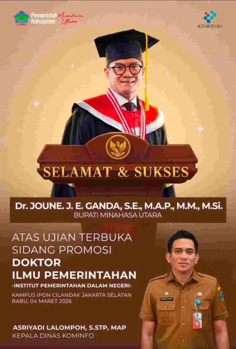 Kominfosan Minut Ucapkan Selamat Kepada Bupati Joune Ganda Raih Gelar Doktor