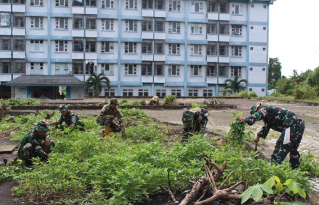 Sejak pukul 08.30 WITA, puluhan prajurit terlihat bergotong royong membersihkan area rusun, baik di bagian luar maupun dalam bangunan.